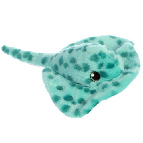Prémium minőségű, Aurora márkájú, 18 cm-es csillogó szemű, kék színű plüss rája, a Sparkle Tales sorozat tagja.