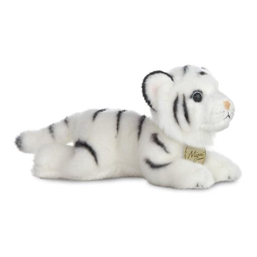 Prémium minőségű, Aurora márkájú, 20 cm-es élethű, fekvő fehér bengáli tigris plüss műanyag szemekkel, a Miyoni sorozat tagja.