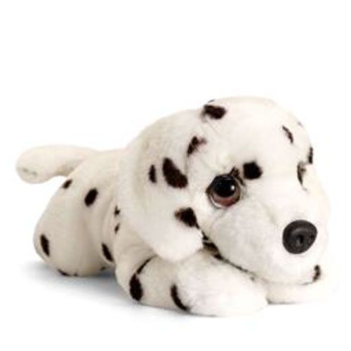Prémium minőségű, Keel Toys márkájú, 25 cm-es fekvő plüss dalmata kutya kölyök, műanyag szemekkel.